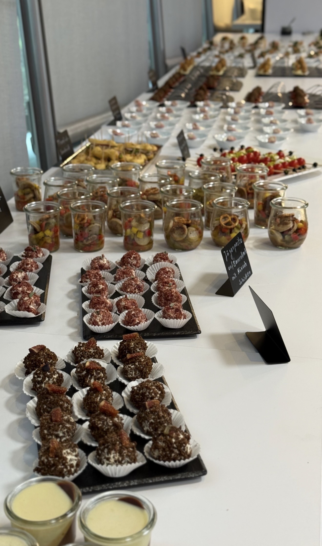 Crêperollen, Ziegenkäse-Feige-Pralinen, gebackene Weißwurst mit Kartoffel-Senf-Püree, Kalbfleischspieße mit Rucola-Vinaigrette, Polpette mit Sugo, Dessertvariationen – eine kulinarische Reise, die Gäste wie Speaker gleichermaßen begeisterte.